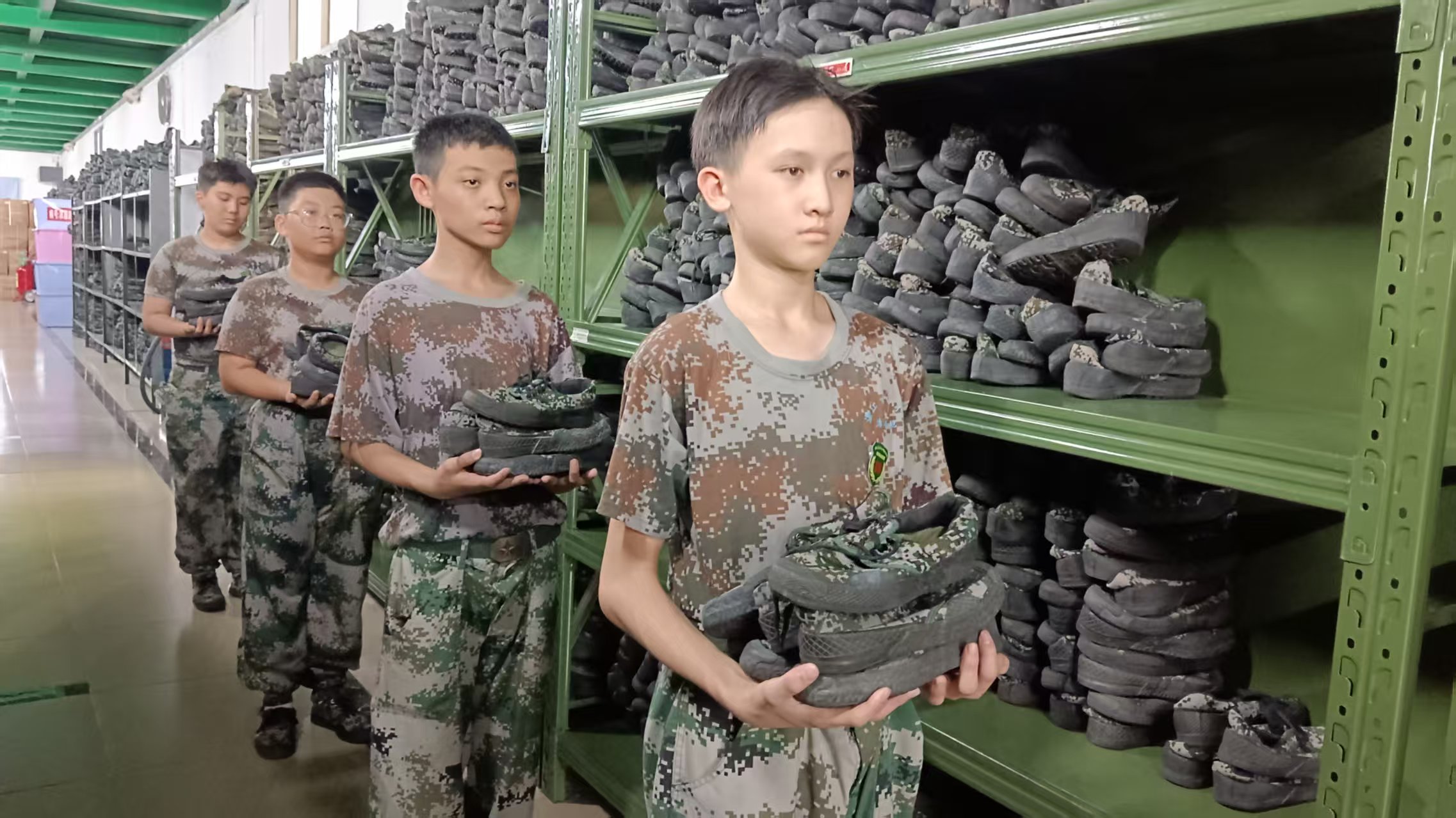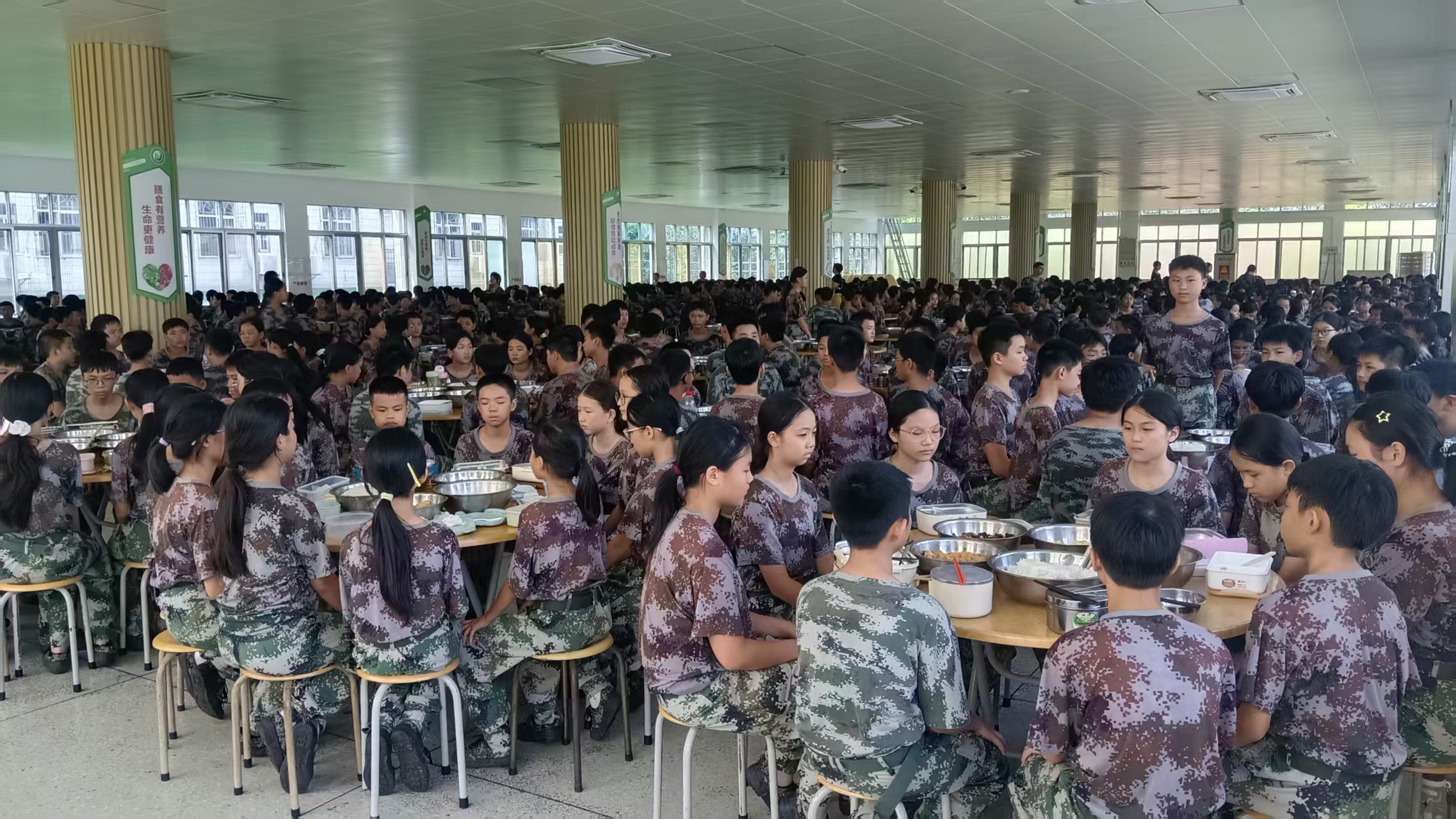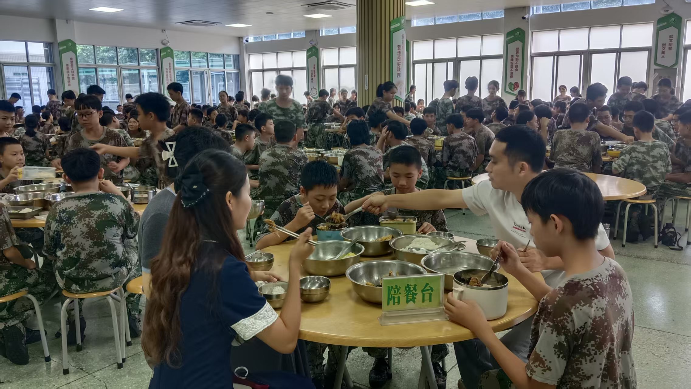 在教官的指挥和带队老师的协助下,饭堂餐桌上早已整齐摆放好饭菜,升腾的热气带着香气,却未打破半分宁静。学生们低头专注用餐,勺子轻碰餐盘的声音微弱得几乎被通风声掩盖,无人交头接耳,整个饭堂只剩细微的进食声,连呼吸都显得格外轻柔,安静温馨的氛围中,透着集体生活的纪律感与默契。