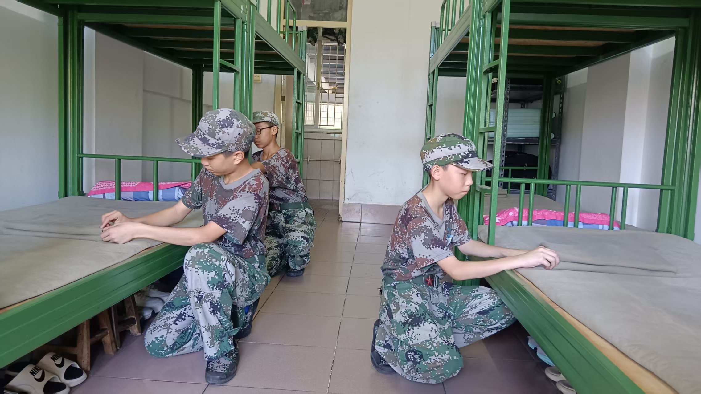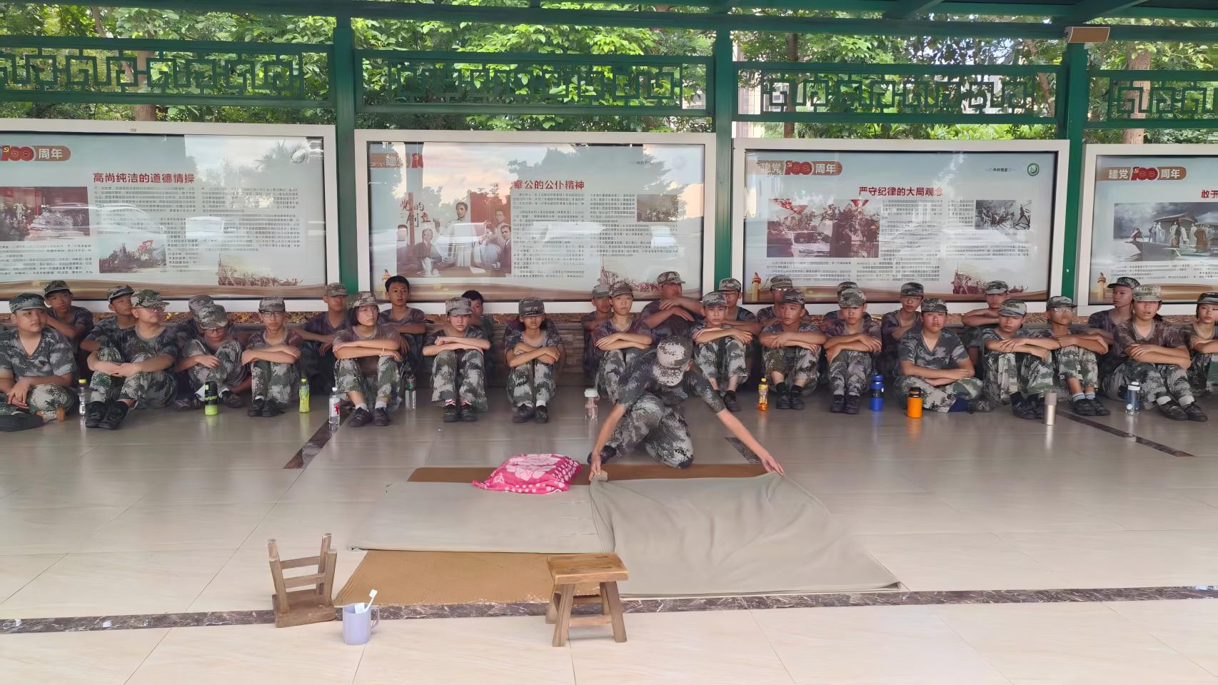 教官以“叠被子”为重点展开内务教学,先一步步示范:将被子铺平压出折痕,再精准对齐对折,最后仔细修出直角,还针对细节标准再次示范。轮到学生们动手实践时,教官蹲在一旁耐心指导,帮大家调整被子边角。很快,同学们便掌握了窍门。现在大家不仅能快速叠好规范的被子,更体会到做好小事情的成就感,也明白整齐的内务能让生活更有条理。