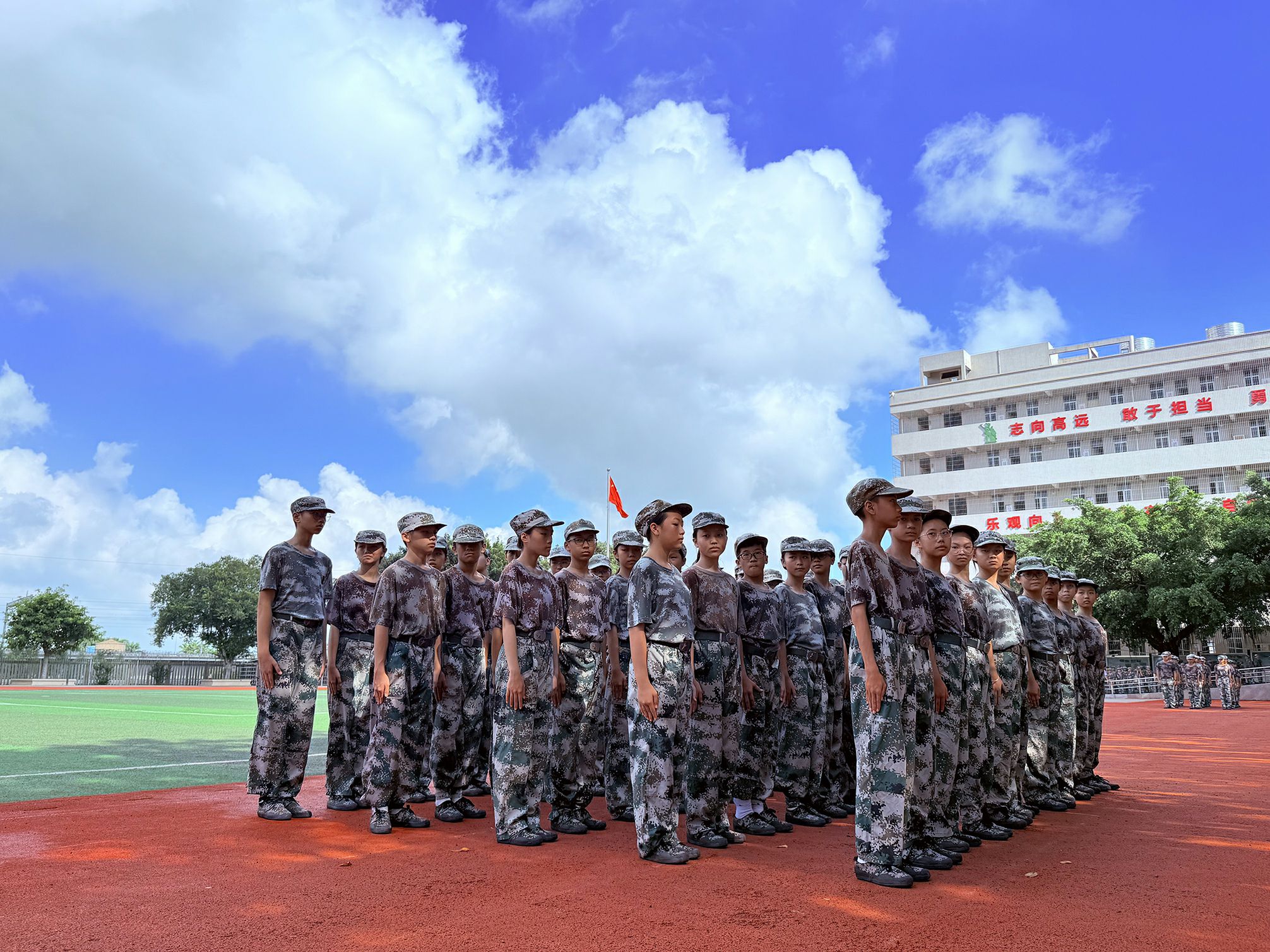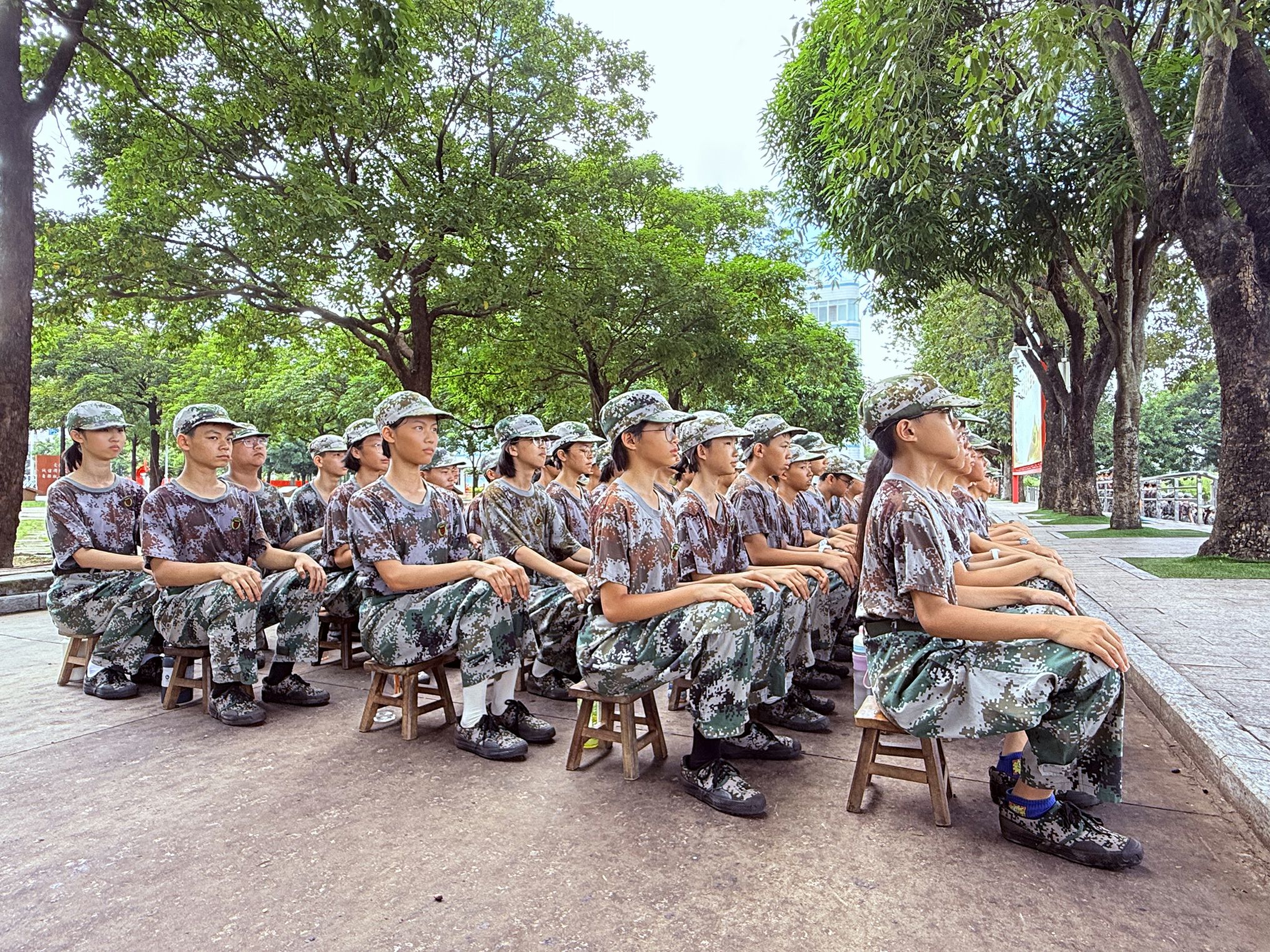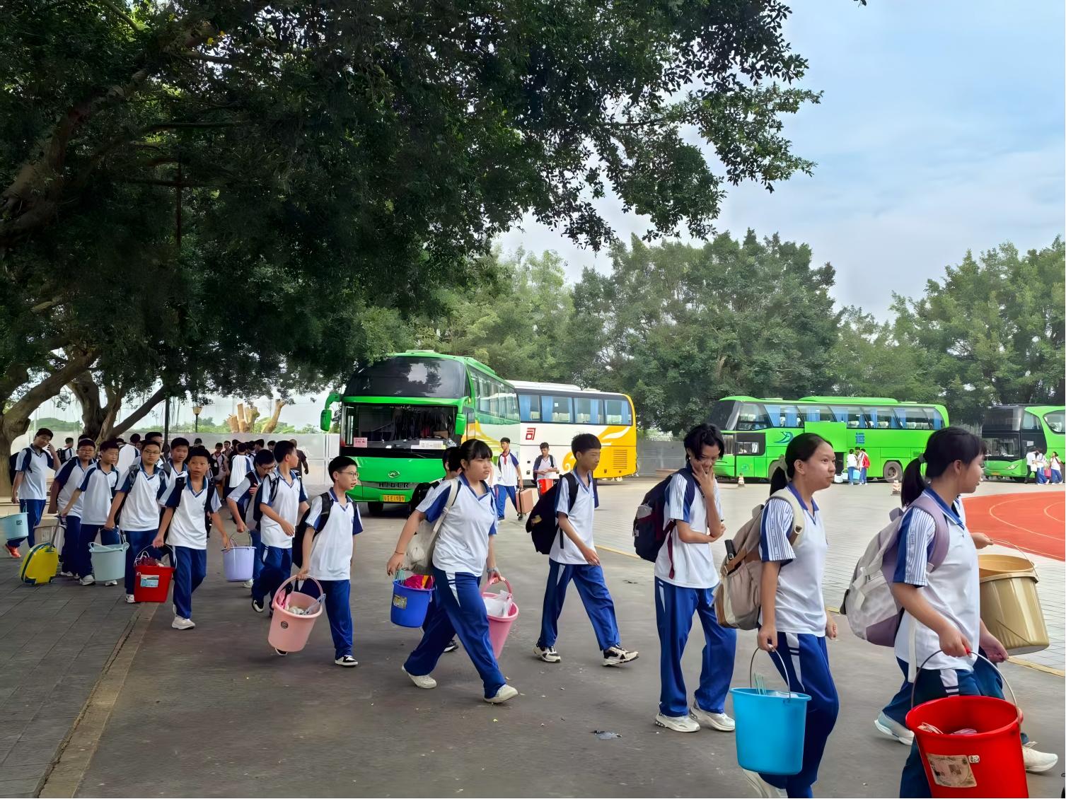 秋风送爽,载着初中学生的大巴车有序驶入基地。车门拉开后,学生们拎着背包、拖着行李箱欢跃下车,背包挂件随脚步轻晃,满是对活动的期待。带队老师组织集合时,教官浑厚的“立正”口令随即传来,学生们迅速收敛起喧闹,在教官的指导下,两分钟内便将松散的队伍整理得整整齐齐;换上迷彩服后,大家瞬间有了“小军人”模样,脸上满是开心与期待,对接下来的生活充满向往。