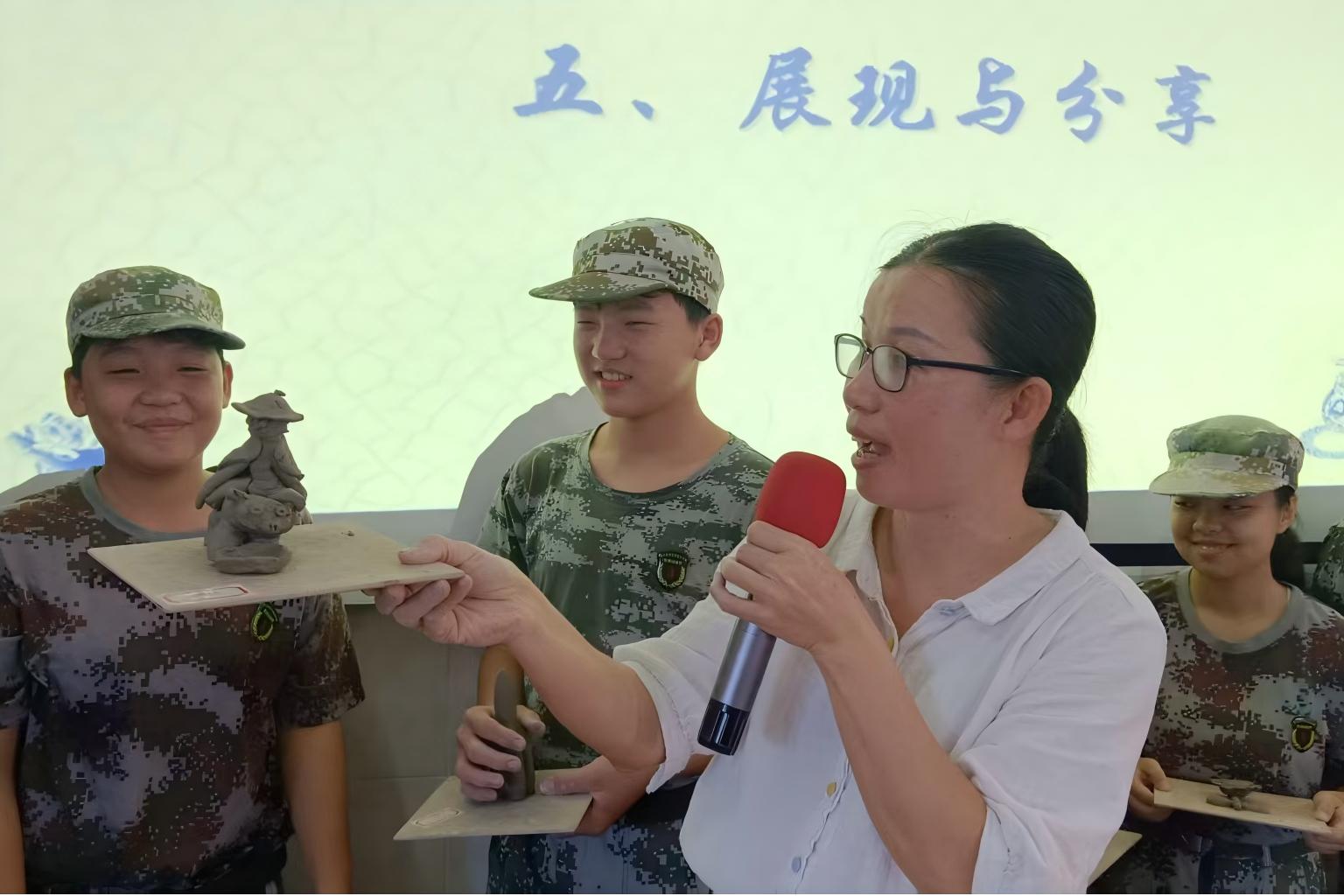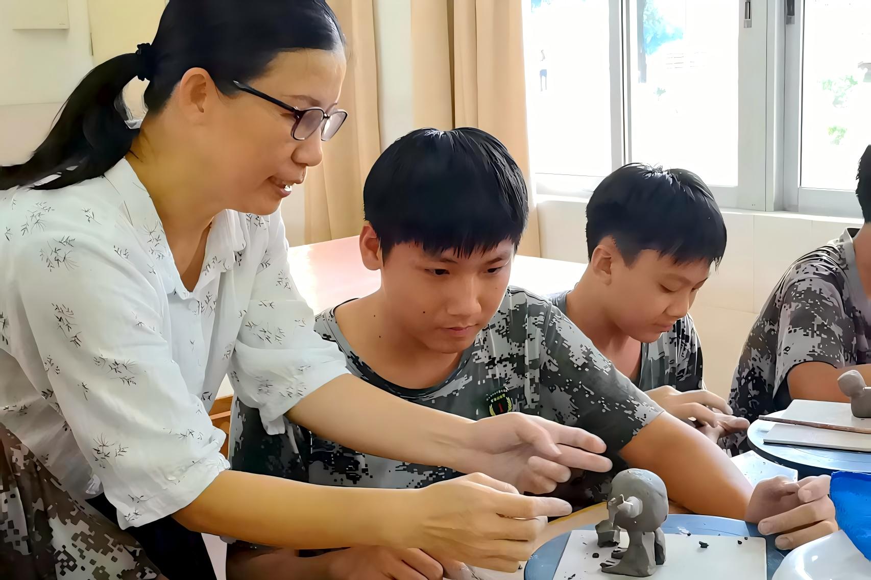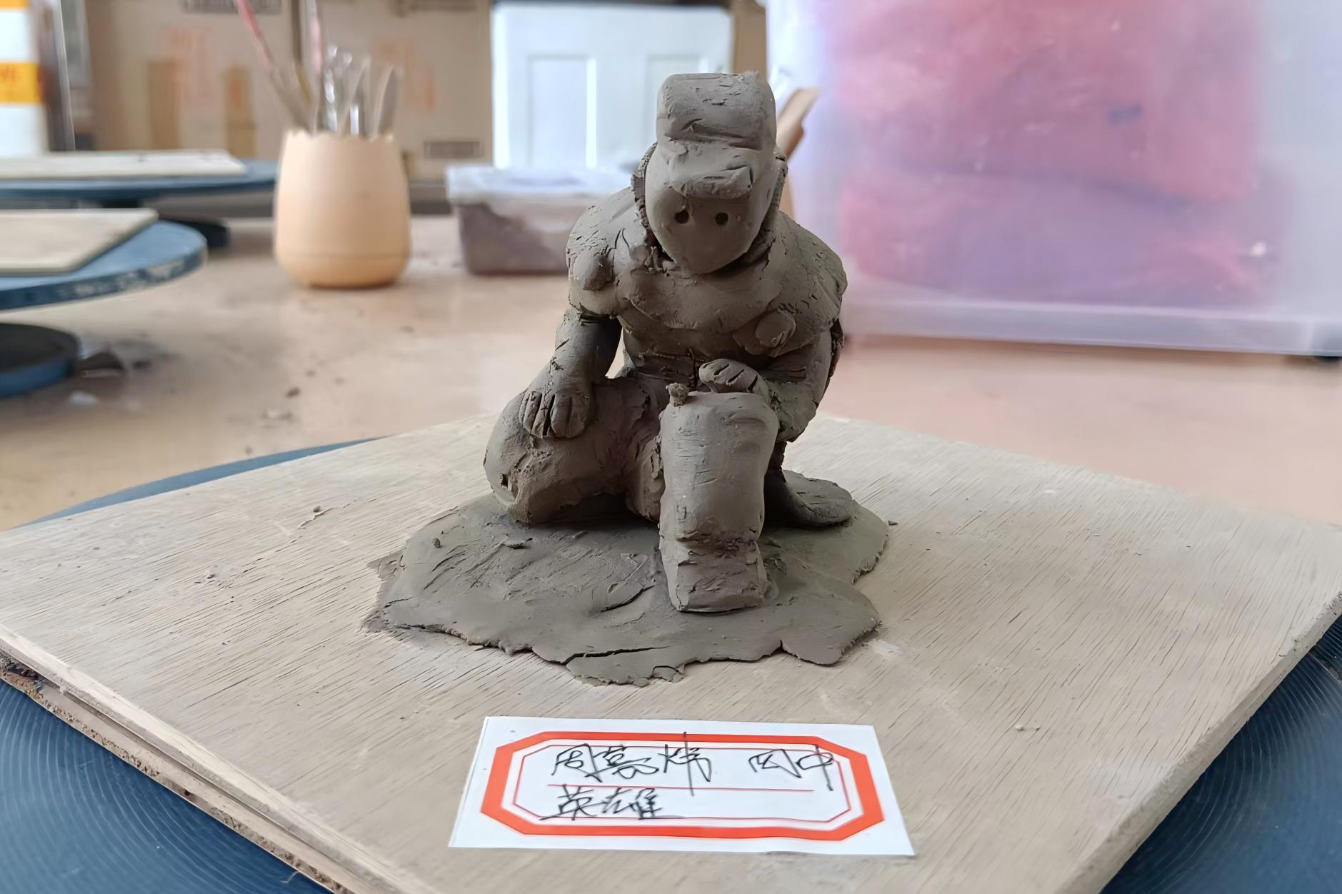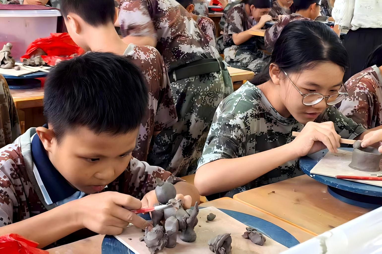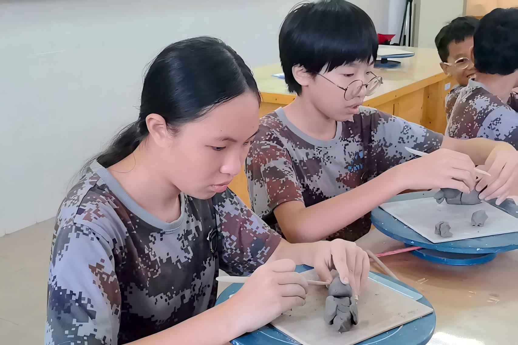 陶艺制作过程中,部分同学遇到泥料开裂的问题,他们主动举手请教,老师耐心指导:“加点水揉匀,慢慢补上去。”问题解决后,大家重新投入创作,脸上满是专注。整个过程中,同学们热情高涨,不仅学会揉泥、塑形等基础技法,更在动手实践中释放创意,体会“从无到有”的创作乐趣,也学会了耐心与合作,深刻感受到传统工艺的独特魅力。每一件作品都凝聚着导师的用心和学生的专注探索。