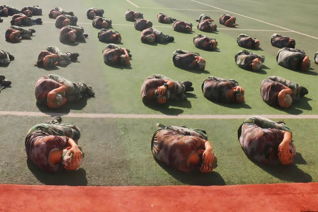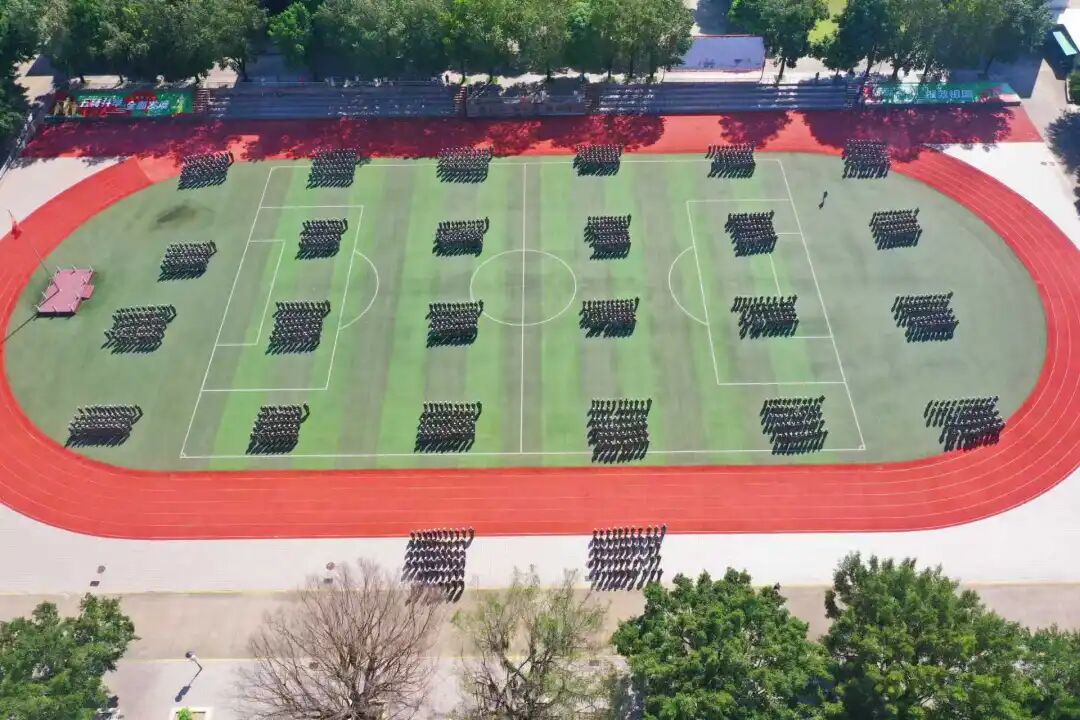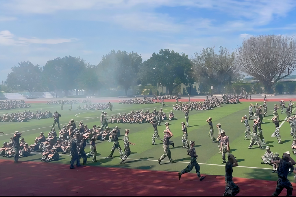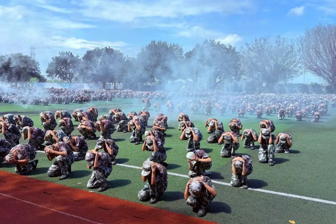 突然,空袭警报以急促的节奏撕裂宁静。刚刚还在调整姿势的学生们瞬间“定格”,与教官同步完成蹲姿防护——屈膝下蹲,双手紧扣后脑,腰背弯成自然的防护弧。1000多个身影在大操场上连成一片,没有丝毫晃动,只有警报的间断鸣响在天地间回荡。