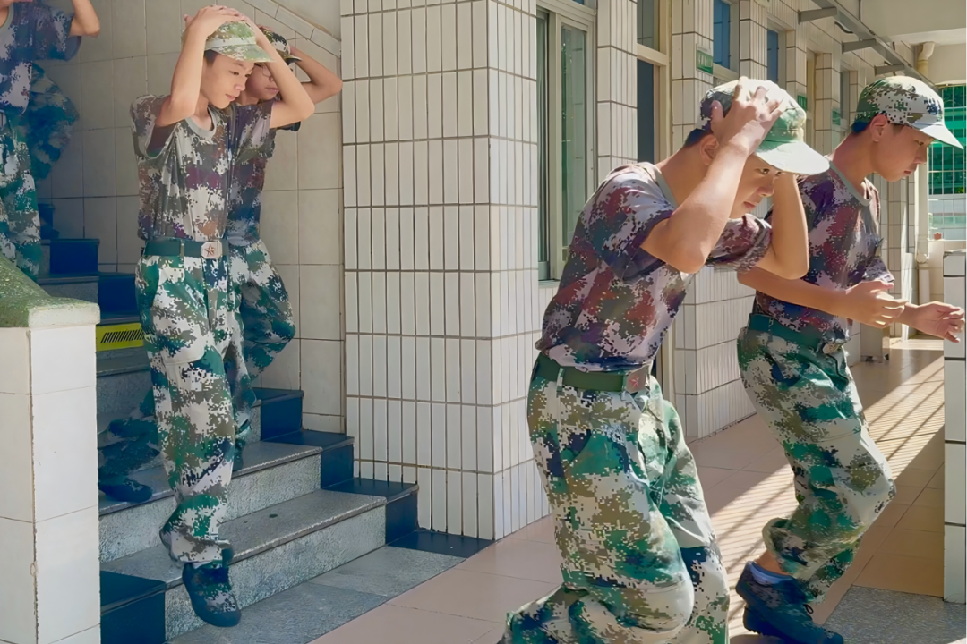 “呜——”随着预先警报的第一声长鸣,宿舍楼内瞬间启动双向疏散:东西两侧楼梯口同时出现身影,同学们纷纷从宿舍奔出,分别沿楼道快速下行。“听到警报声心里一紧,立刻想起之前教官强调的要领!”一位同学双手交叠紧扣后脑,弯腰成近90度抵姿往楼梯口移动。楼道里,大家保持同样姿势,没有推挤,没有喧哗,队伍如同训练有素的小战士,默契地向着大操场集合点进发。短短几分钟,所有新生便在指定区域整齐列队,额角的汗珠与专注的眼神,见证着他们的认真与严谨。