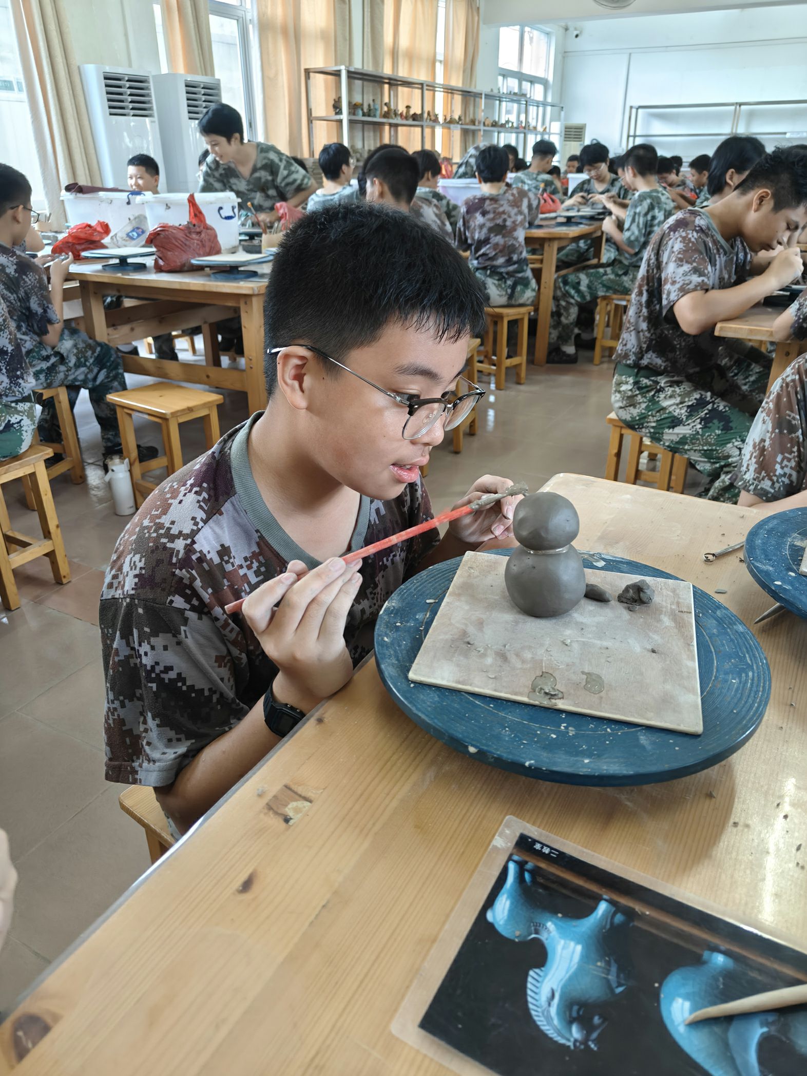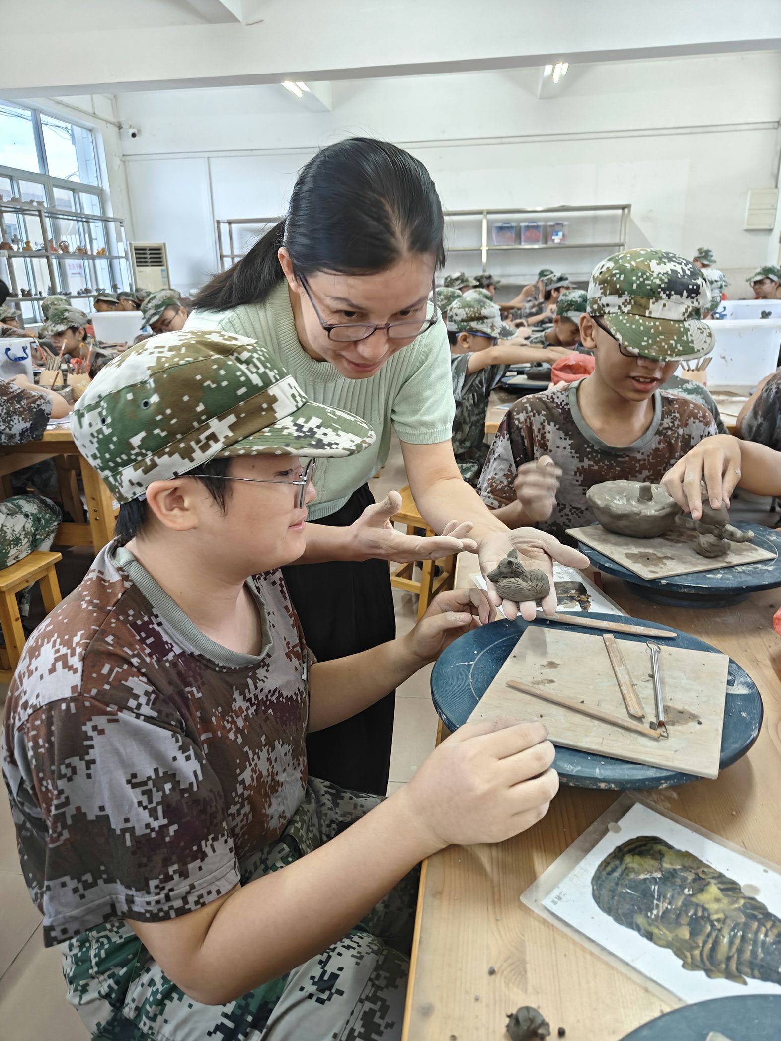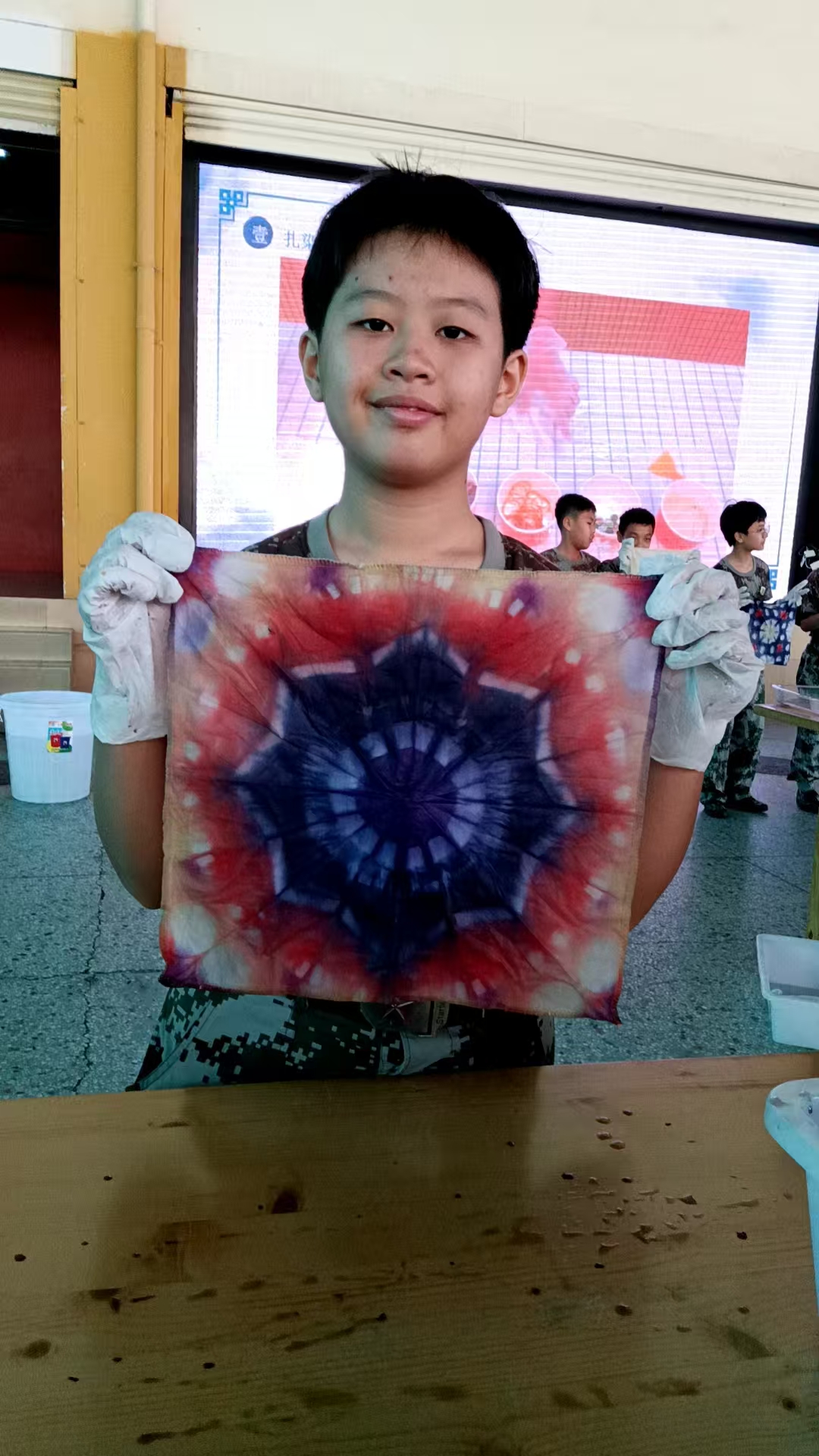 实践课程精彩纷呈,消防体验、生命教育、扎染、泥塑、人防海防…少年们动手体验、大胆创新,传统技艺与现代知识碰撞出思维的火花。在人防海防宣教中认识大国重器、增强国防观念;在生命健康教育中理解生命意义,培养健康生活意识;在消防安全体验中学习消防知识,掌握逃生技能;而泥塑体验与扎染技艺,更成为大家的“心头好”。少年们以泥土为媒介,尽情发挥创意,在揉捏塑造中感受非遗艺术的魅力;在布帛之上,渲染出独一无二的图案,蓝白交织的纹样如被赋予生命,似水墨般肆意流转、翩然起舞,令人惊叹。