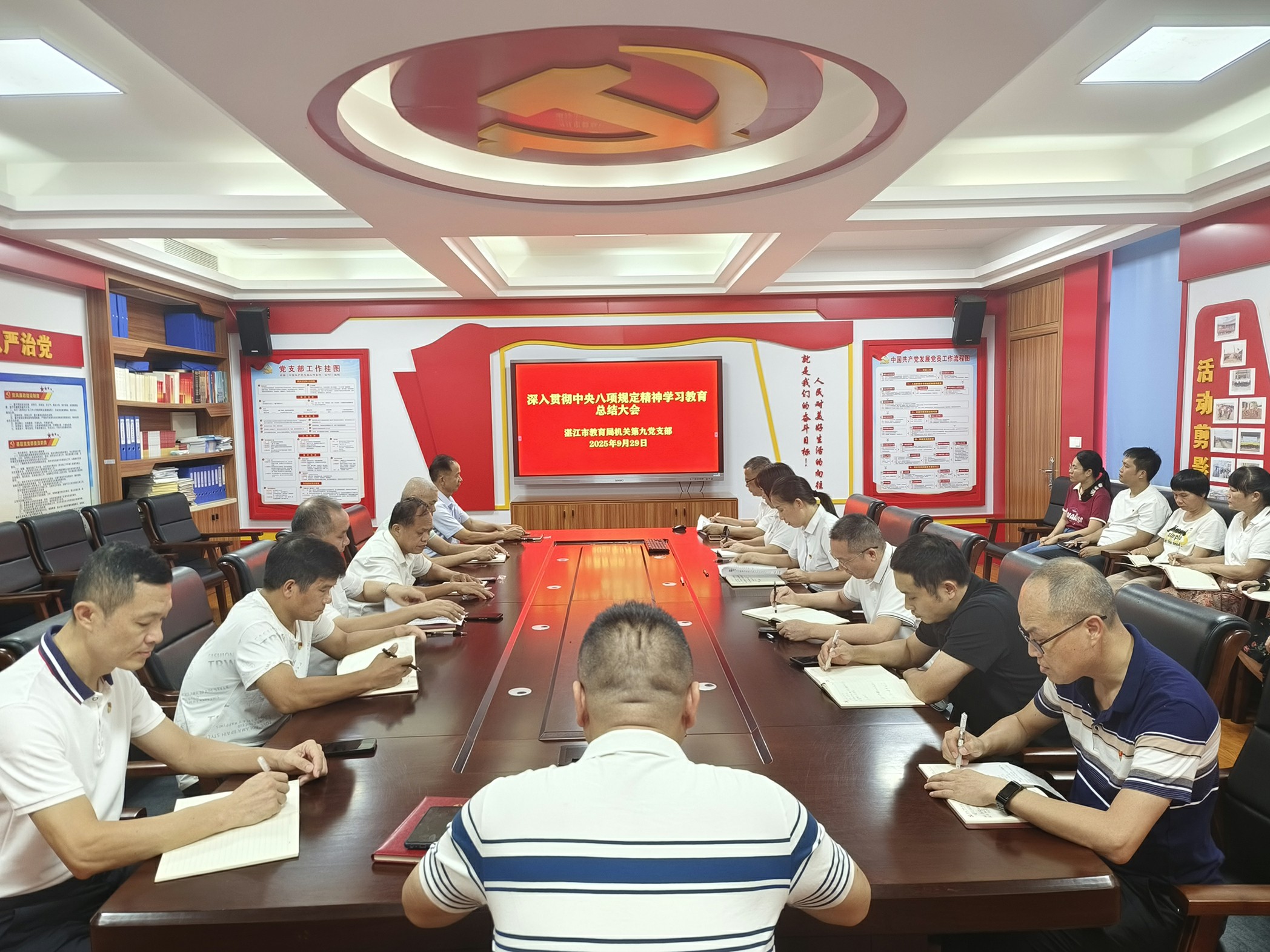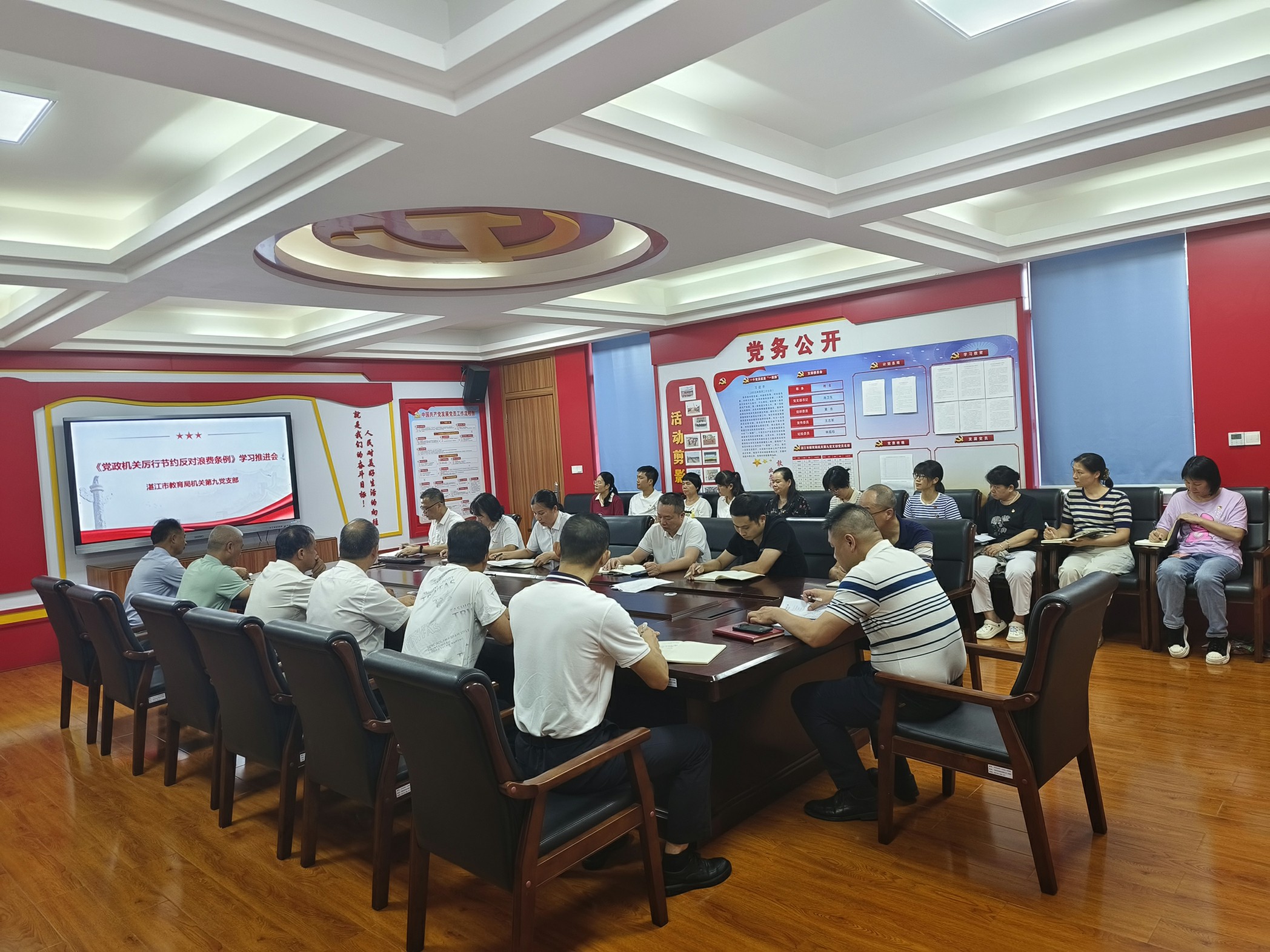 9月29日下午,湛江市教育局机关第九党支部在市德育基地党员活动室先后召开“深入贯彻中央八项规定精神学习教育总结大会”与“《党政机关厉行节约反对浪费条例》学习推进会”,全体党员围绕作风建设与节约型机关建设展开集中学习,旨在推动相关要求落地见效。