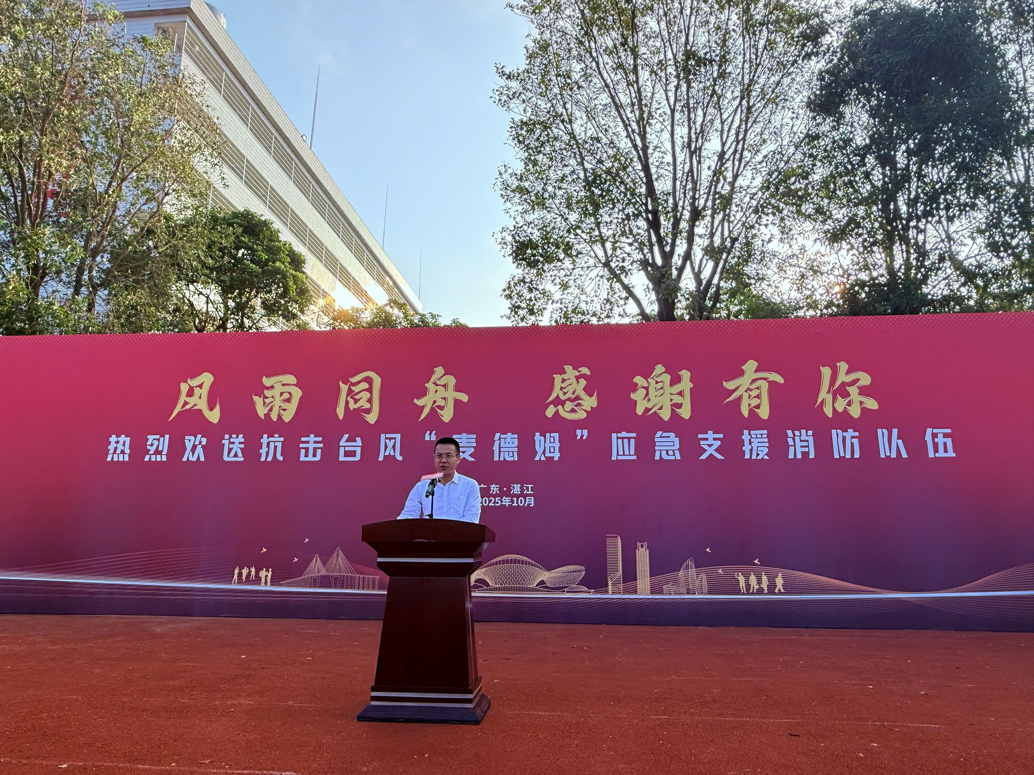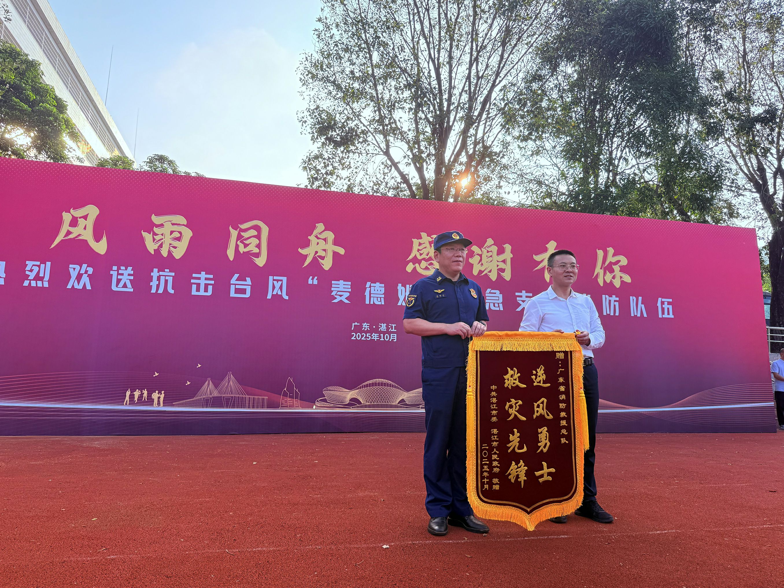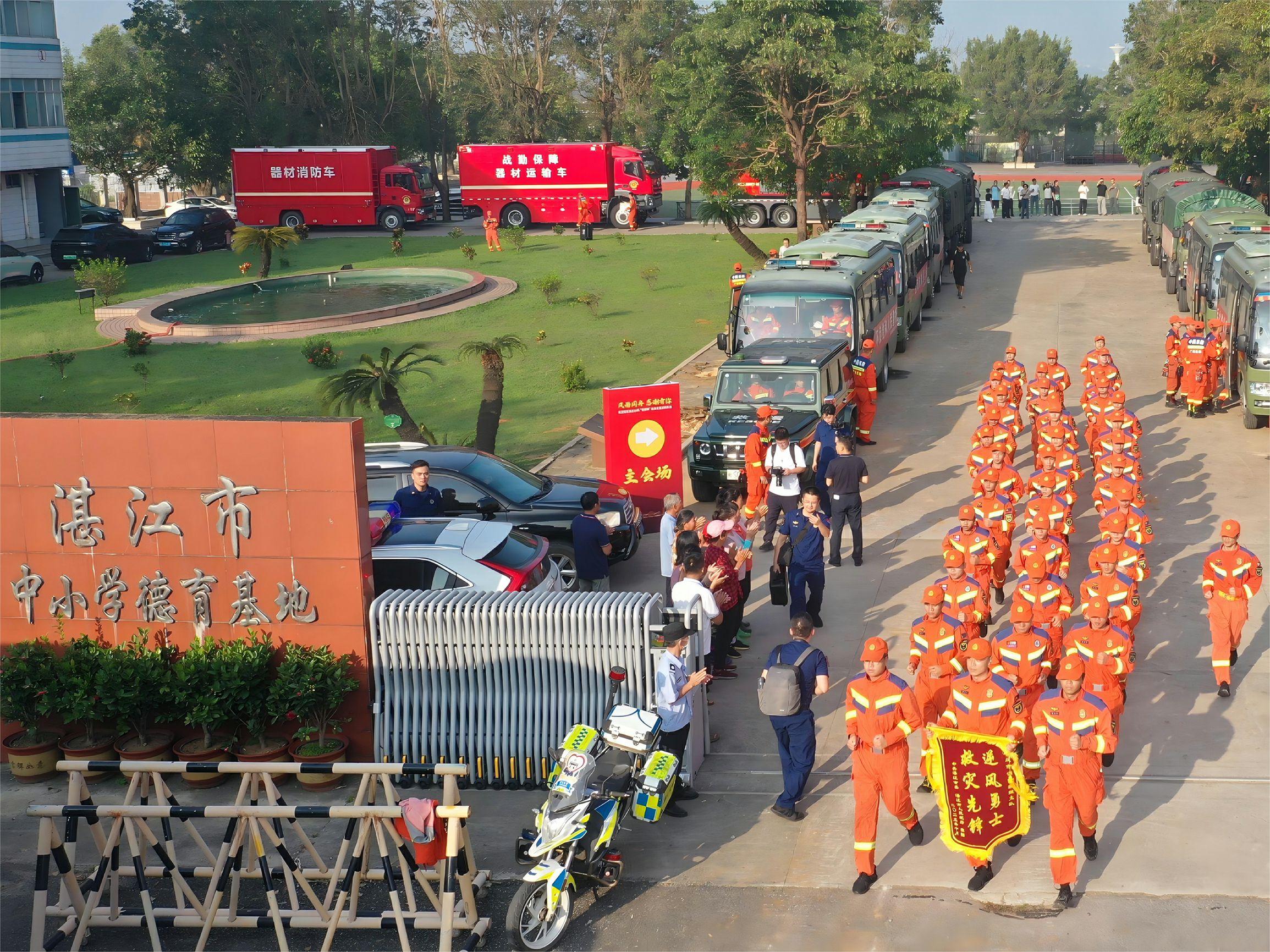 10月10日,湛江市中小学德育基地内温情涌动,一场简朴而隆重的欢送仪式在此举行,向广东消防救援机动队总队抗击台风“麦德姆”应急支援队伍的队员们致敬。