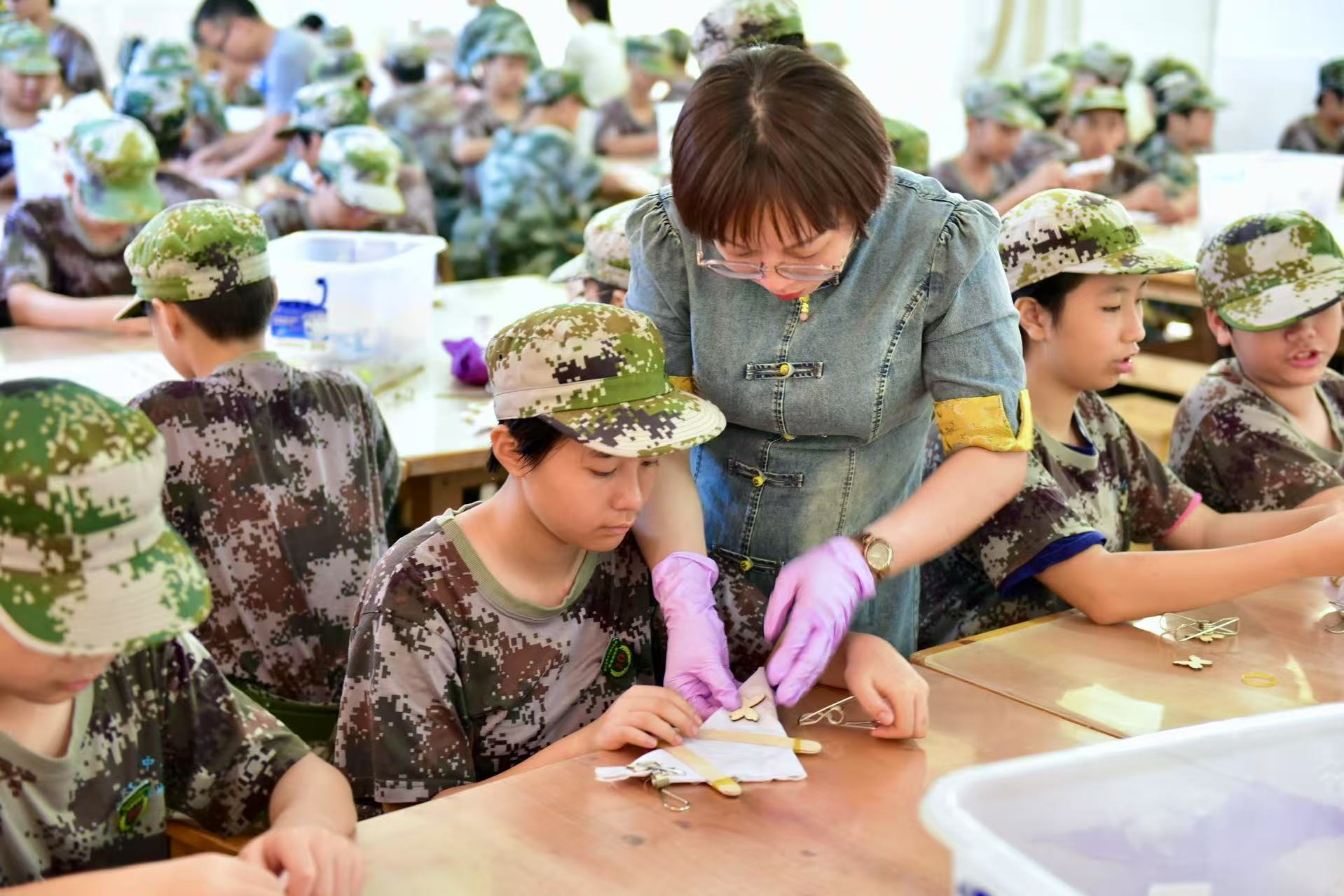 习法:打破传统教室局限,从扎结技法入手,带领学生走进实践场景,与纯棉布料、植物染料深度互动,掌握捆扎、浸染等核心技艺,同步渗透自然、生化学科知识,读懂材料与自然共生之道,筑牢实践根基。